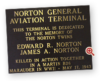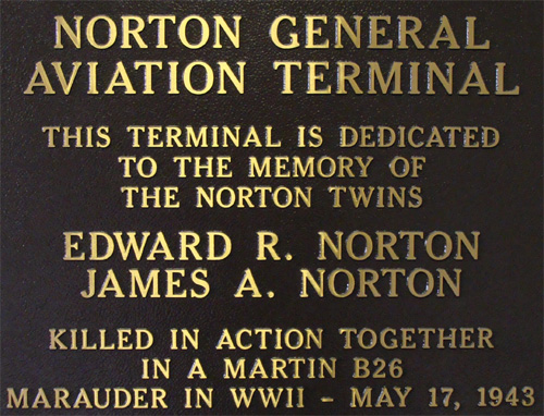 Though the Norton twins died over 70 years ago, the people of Conway, South Carolina still remember the two aviators. In 2010 in memory of the brothers a new terminal at the Myrtle Beach airport, just east of Conway, was named after them: Norton General Aviation Terminal. A plaque commemorates them.