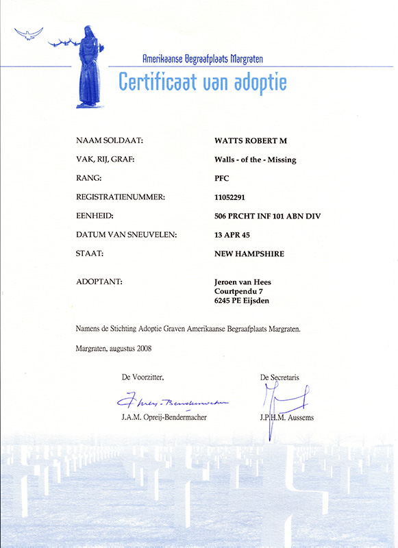 The name of Robert M. Watts on the Walls of the Missing has been adopted by Jeroen van Hees. Together with his father Arie-Jan, Jeroen has extensively researched the life and death of 'his' soldier.