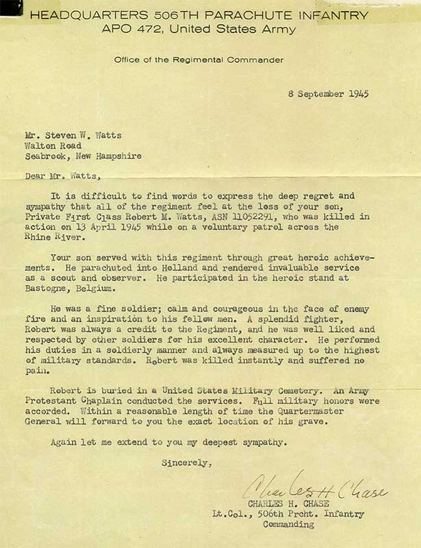 – a letter to the Watts family. He described their son as "a fine soldier, calm and courageous in the face of enemy fire and an inspiration to his fellow men." He also mentions that Robert is buried in an American military cemetery and that a religious service had taken place. That was not right as Robert was missing.