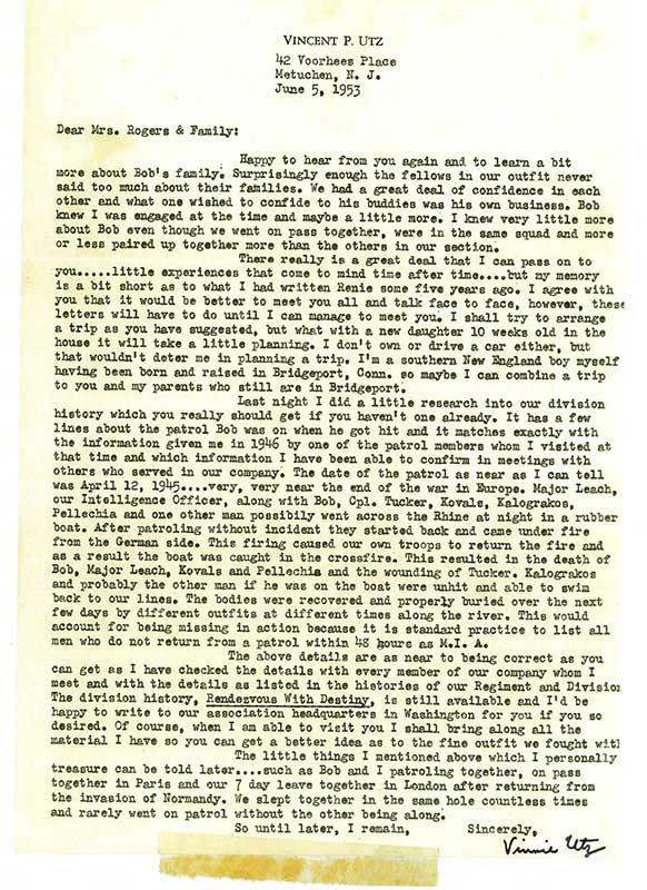 Robert's best friend Vinnie Utz contacted the family after the war. A letter from 1953, which has been preserved in the archives of the Watts family, shows that Utz himself investigated what had happened on the night of 12 April. He could tell the Watts family many previously unknown facts about Robert's death. If Utz had not been injured in Bastogne, he might well have been present that particular night on the Rhine ...