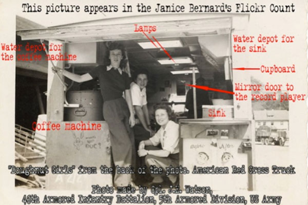Every Clubmobile was equipped with a small kitchen, which had a donut machine, coffee urns and other supplies. in addition to coffee and donuts, soldiers could also get (free) gum, cigarettes, magazines and newspapers.