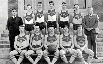 Photo from a yearbook 1936. Vinnie Utz - with ball in hand - amid the basketball team